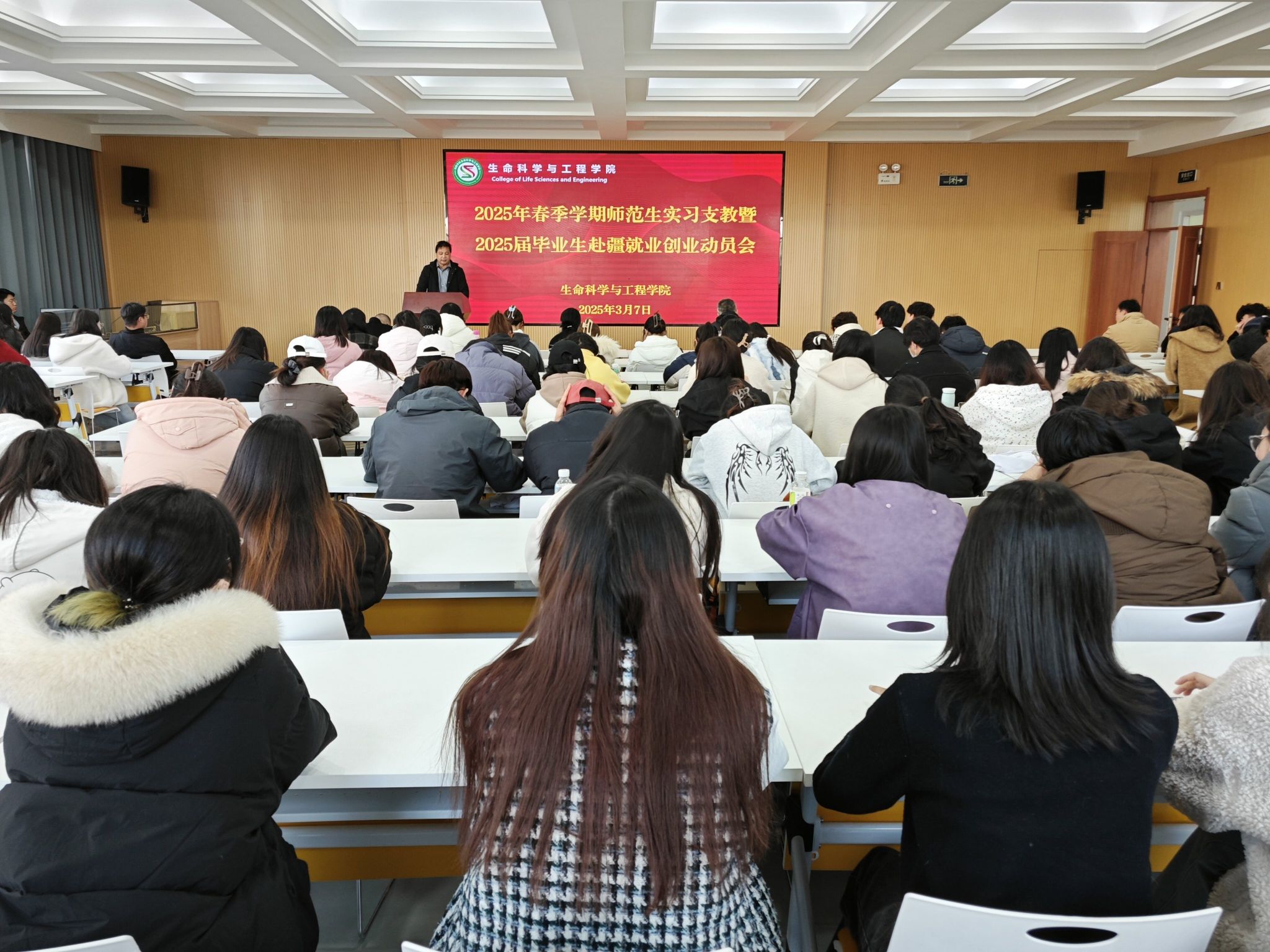 3月7日下午,87978797威尼斯老品牌召开师范生实习支教动员会,为即将奔赴新疆、甘肃实习支教的2022级师范生加油鼓劲,明确实习任务与目标。会议由学院负责人、辅导员、实习指导教师及2022级生物科学专业全体学生约130人参加。