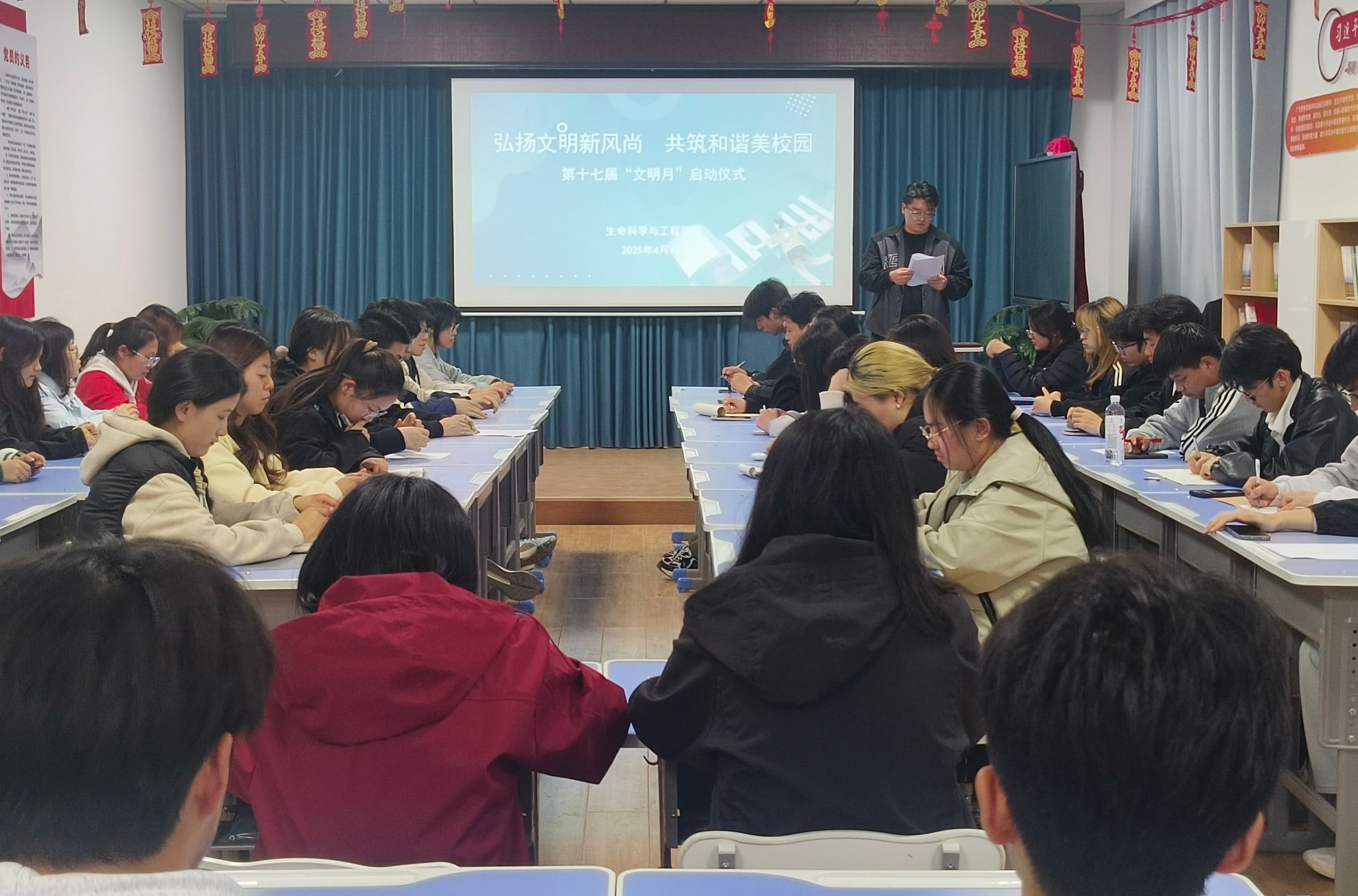 4月7日,87978797威尼斯老品牌举行“弘扬文明新风尚,共筑和谐美校园”第十七届“文明月”活动启动仪式,辅导员、各班学生干部和学生代表共计六十余人参加。