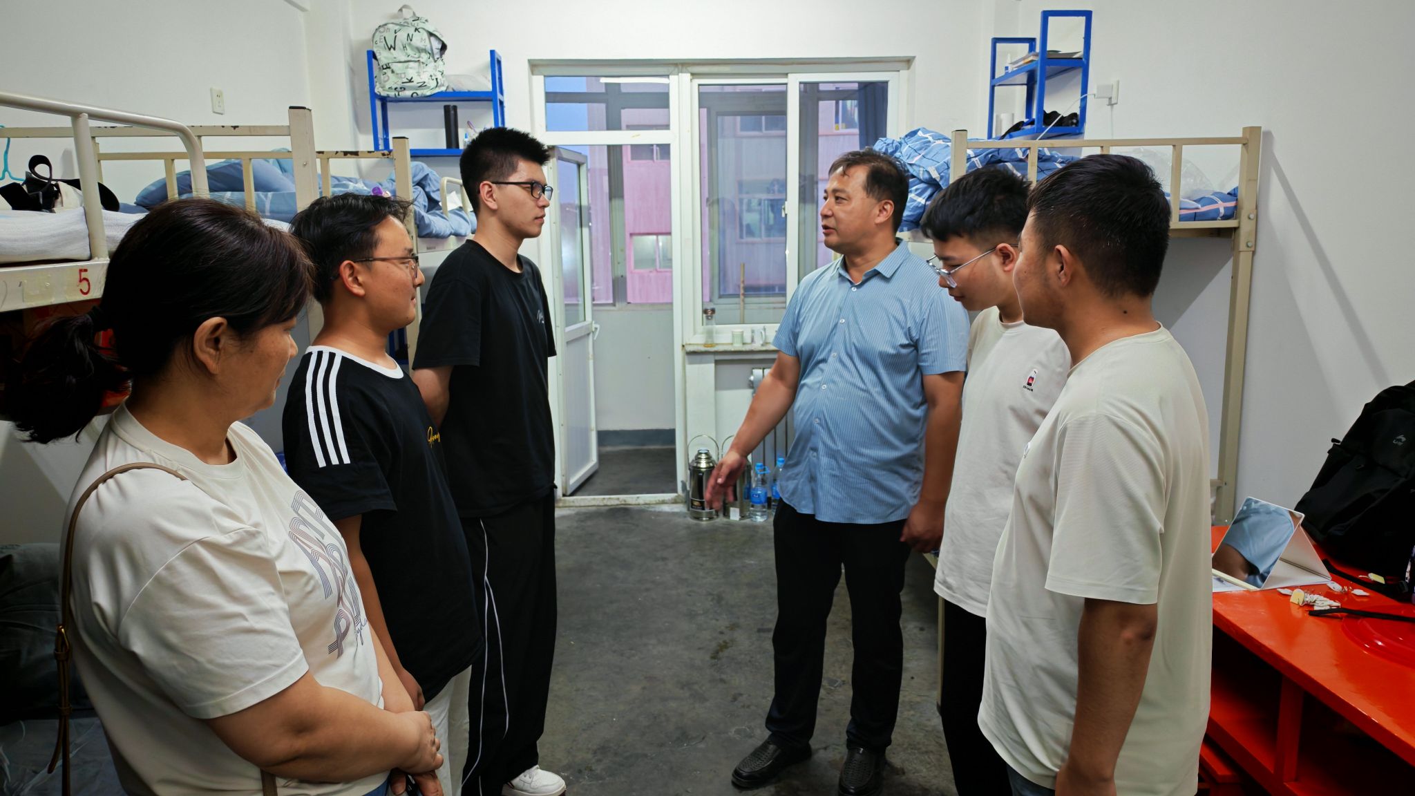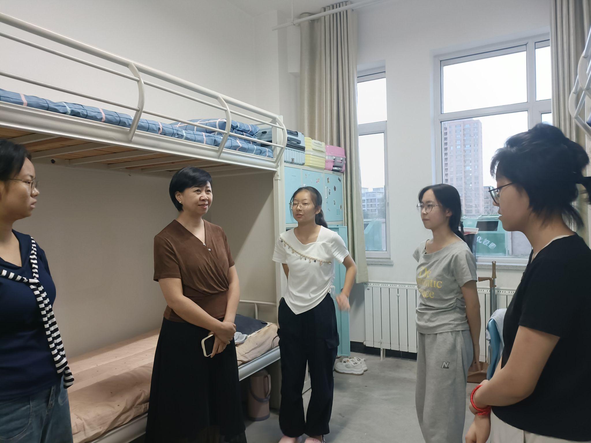 活动中,学院班子成员与班主任、辅导员逐间走访学生宿舍。在新生宿舍,老师们热情地与新生交流,详细询问新生的住宿、饮食适应情况及入学感受,耐心解答大家关于专业学习、校园生活服务等方面的疑问,叮嘱大家尽快转换角色,与室友建立和谐关系,以积极心态开启大学生活。在慰问交流的同时,重点围绕宿舍安全展开细致检查,向同学们普及安全用电、防火防盗、防电信网络诈骗等知识,提醒大家养成良好习惯,保持宿舍清洁卫生、做好个人健康防护,提高安全意识,筑牢安全防线。